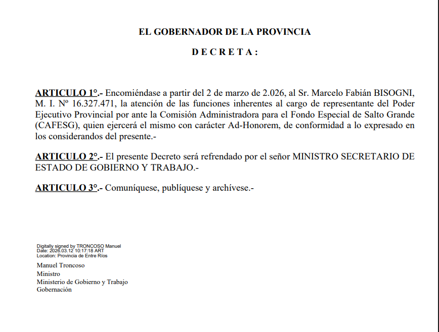 Y el 16 de marzo de 2026, por decreto DTO-2026-629-E-GER-GOB, se rectificó otra designación previa en el Ministerio de Desarrollo Humano, donde se habían dejado sin efecto designaciones anteriores y nombrado nuevas funcionarias en cargos de dirección y secretaría privada. Otra vez: rotación, reemplazos, reacomodamientos, nuevos nombres y más arquitectura política en la cúpula del Estado.