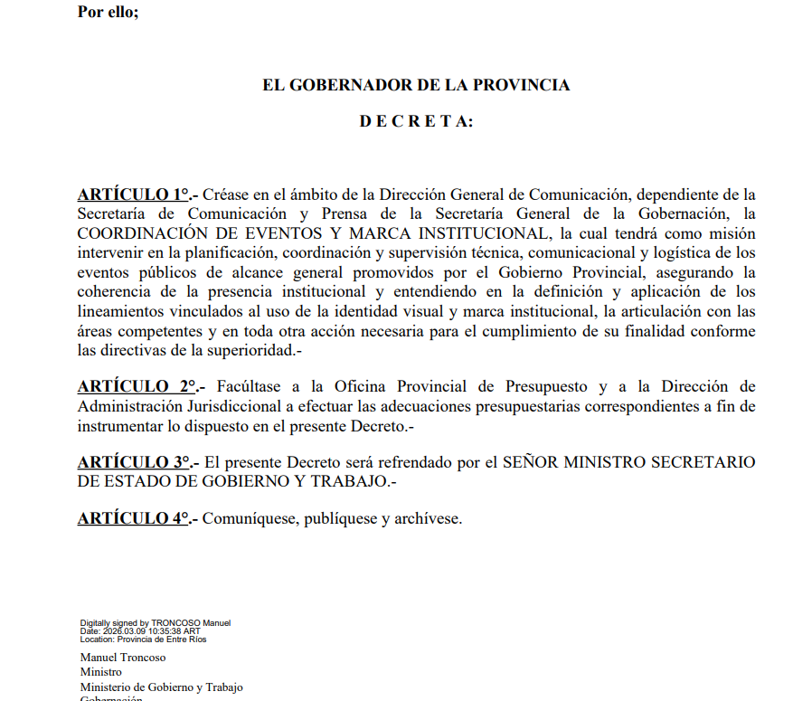 Los papeles hablan solos. El 12 de marzo de 2026, por decreto DTO-2026-601-E-GER-GOB, el Ejecutivo creó una nueva “Coordinación de Eventos y Marca Institucional” en el ámbito de Comunicación, facultando incluso las adecuaciones presupuestarias necesarias para ponerla en marcha. No se trata de un área vinculada a salud, producción, seguridad o educación. Es, lisa y llanamente, otra estructura burocrática en un Estado que supuestamente venía a achicar cargos y racionalizar gastos.