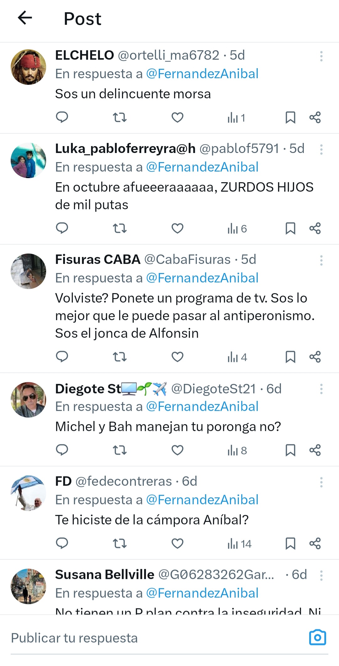Los comentarios fueron inmediatos y lapidarios. Algunos usuarios reaccionaron con frases como “En octubre afueeraaaaaa, zurdos hijos de mil p…”, mientras otros fueron más directos: “Michel, ¿el que manejó la fiesta de las SIRAS con Massa?”, “Sos un delincuente morsa” o “¿Te hiciste de La Cámpora, Aníbal?”. El repudio fue tan masivo como espontáneo.