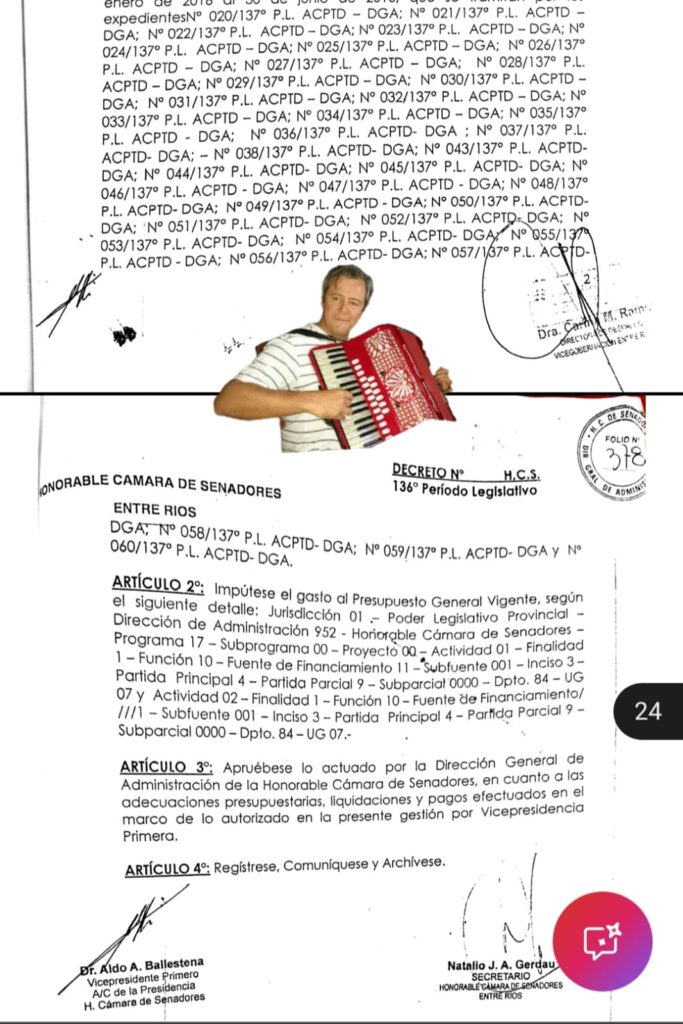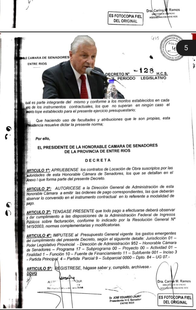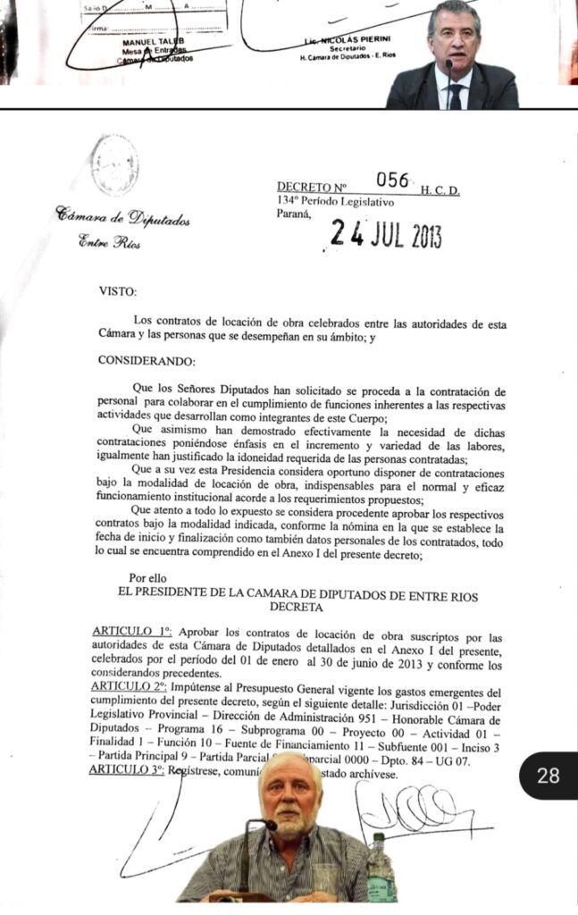 • Decretos con las firmas de Adán Bahl, José Lauritto, José Cáceres, Ángel Allende y Sergio Urribarri.