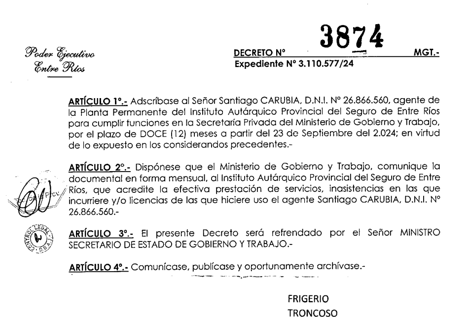 Por su parte, Santiago Carubia tuvo funciones en el Instituto Autárquico del Seguro de Entre Ríos (IAER), organismo que durante la gestión de Gustavo Bordet fue conducido alternativamente por los hermanos de los entonces vicegobernadores Adán Bahl y Laura Stratta, en una estructura compartida entre poder político y administración paraestatal.