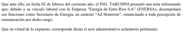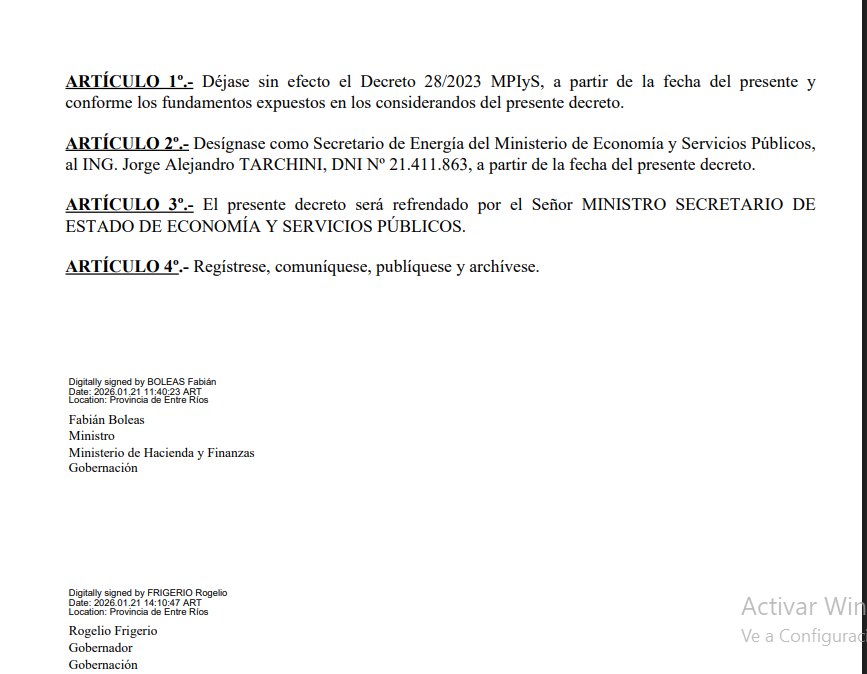 En el caso de Jorge Alejandro Tarchini, los decretos aportados son claros: fue designado secretario de Energía de Entre Ríos y luego el propio Poder Ejecutivo dejó asentado que, por su vínculo laboral con ENERSA, ejercería el cargo ad honorem, renunciando a la remuneración. El problema no desaparece porque desaparezca el sueldo. El problema sigue ahí: si un funcionario conserva un pie en la empresa y otro en el escritorio estatal desde donde se define la política energética, entonces sigue parado en los dos lados del mostrador.