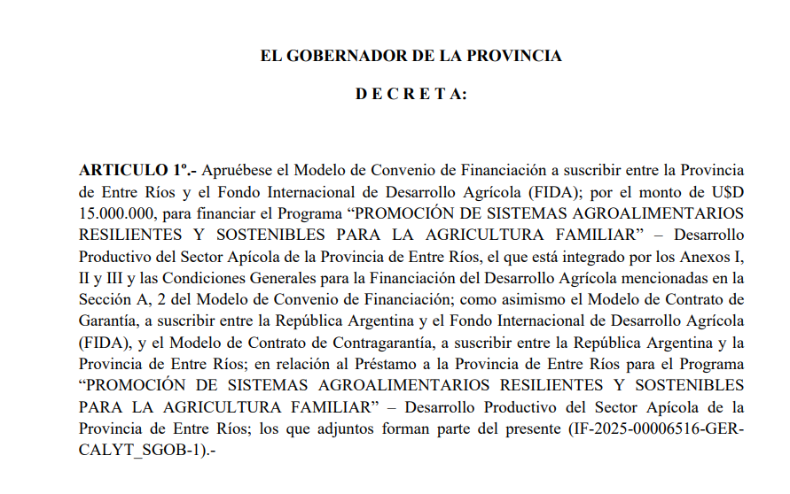 Son USD 15 millones del FIDA para el “PROSAF apícola”. Se paga en dólares, con cuotas semestrales, y la coparticipación queda en garantía. La excusa es la miel; el verdadero tablero son los caminos rurales.
