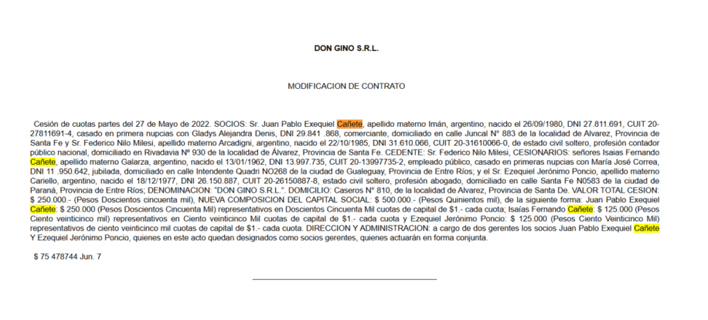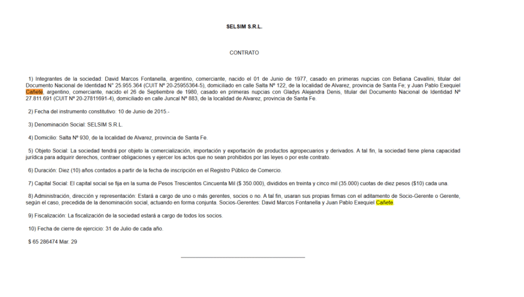 Una vez en control de la caja, Cañete no copió a Moreyra: lo superó. Usó los fondos públicos para montar desde cero un holding agropecuario en Rosario. Las empresas Don Gino SRL y Selsim SRL, a nombre de su hijo Juan Pablo Exequiel Cañete, comenzaron con un capital ínfimo en comparación al volumen que moverían luego.