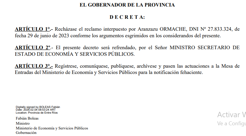 El dato es concreto: el decreto DTO-2026-283-E-GER-GOB, fechado el 10 de febrero de 2026, rechaza formalmente el planteo administrativo de Ormache . O sea: en la vía administrativa, la hija de la intendenta de Paraná perdió.