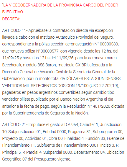 El Decreto 3.948/2025 —firmado por la vicegobernadora Alicia Griselda Aluani y refrendado por el ministro Manuel Troncoso— aprobó la contratación con IAPSER para asegurar una aeronave Beechcraft B58 Baron, matrícula CX-BRI, por USD 22.702,19 anuales, con vigencia del 11/09/2025 al 11/09/2026.
