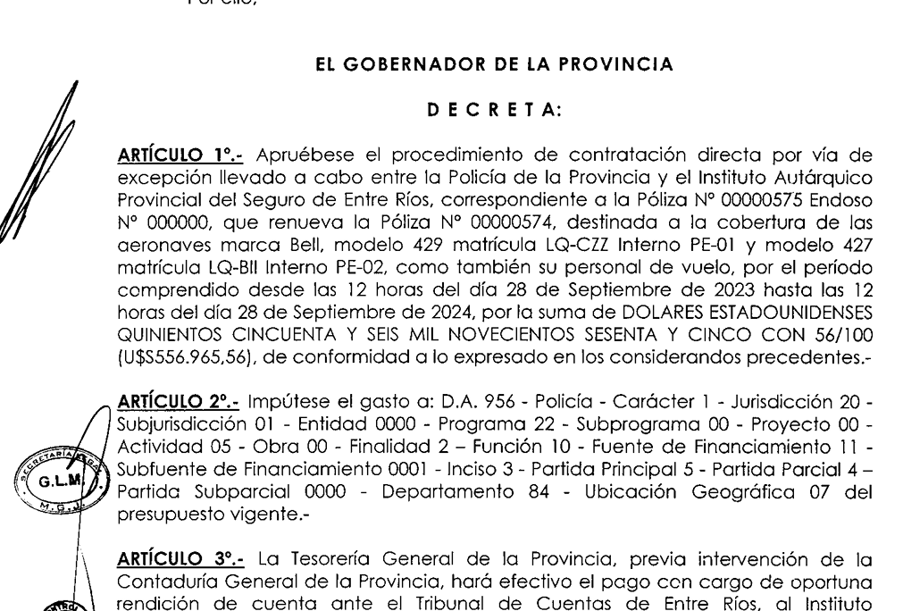 Ahí aparece la pieza documental que fija el estándar de lo desmesurado. El Decreto N.º 4467/2023 dejó asentada una contratación directa “por vía de excepción” con IAPSER para asegurar dos aeronaves Bell (internos PE-01 y PE-02), incluyendo “personal de vuelo”, por un total anual de USD 556.965,56, con vigencia del 28/09/2023 al 28/09/2024.